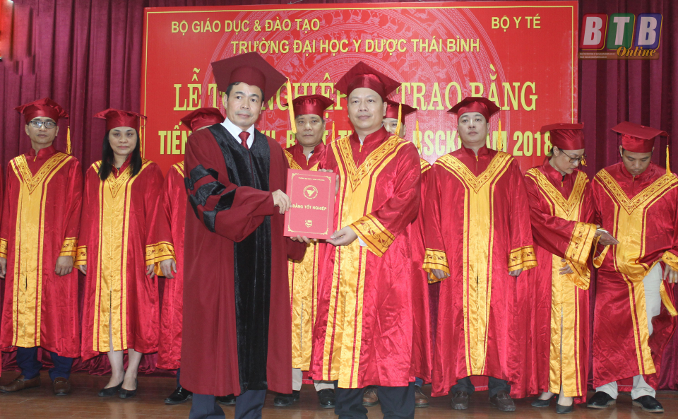 Lãnh đạo Trường Đại học Y Dược Thái Bình trao bằng tốt nghiệp năm 2018 cho 01 tiến sĩ.