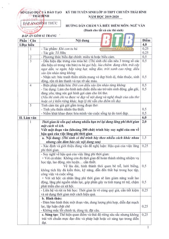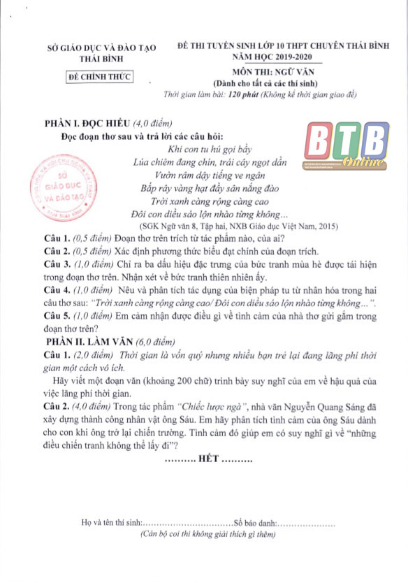 Để cung cấp đến bạn đọc, đặc biệt là các bậc phụ huynh và các thí sinh tham dự kỳ thi tuyển sinh vào lớp 10 THPT chuyên năm nay những thông tin chính xác nhất về đáp án của môn Ngữ văn và các môn thi khác, phóng viên Báo Thái Bình đã trực tiếp làm việc với lãnh đạo Sở Giáo dục và Đào tạo, lãnh đạo Phòng An ninh chính trị nội bộ, Công an tỉnh về nội dung trên.