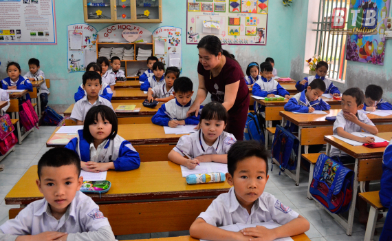 Giờ học của cô và trò Trường Tiểu học Vũ Lạc, thành phố.