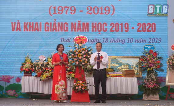 Đồng chí Đàm Văn Vượng, Ủy viên Ban Thường vụ Tỉnh ủy, Phó Chủ tịch thường trực HĐND tỉnh tặng hoa chúc mừng nhà trường.