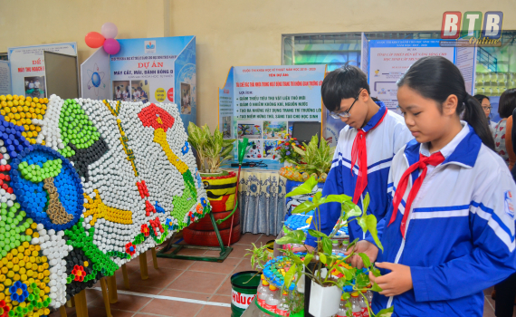 Cô giáo Hà Thị Minh Ngọc, Trường THCS Tiền Phong, giáo viên hướng dẫn học sinh thực hiện dự án tái chế rác thải nhựa trong hoạt động trang trí không gian trường lớp cho biết: Trong quá trình thực hiện dự án, tôi đã hướng dẫn học sinh chuẩn bị vật liệu và các bước tiến hành, với từng công đoạn các em đã thể hiện được sự sáng tạo, tỉ mỉ, khéo léo trên các sản phẩm mô hình trang trí lớp học từ rác thải nhựa như thư viện xanh, bồn cây em chăm, không gian xanh lớp học, dùng nút chai làm thành tấm bản đồ Việt Nam, thùng đựng rác bằng vỏ chai nhựa, chậu để trồng cây bằng lốp xe...