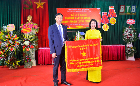 Thừa uỷ quyền của Thủ tướng Chính phủ, đồng chí Đỗ Đình An, Uỷ viên Ban Thường vụ Tỉnh uỷ, Bí thư Thành uỷ, Chủ tịch HĐND thành phố trao Cờ thi đua của Chính phủ cho nhà trường.