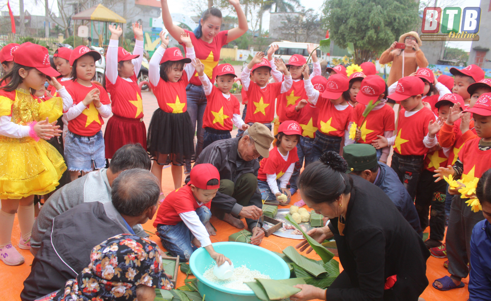 Các cháu học sinh cùng phụ huynh thi gói bánh chưng xanh.