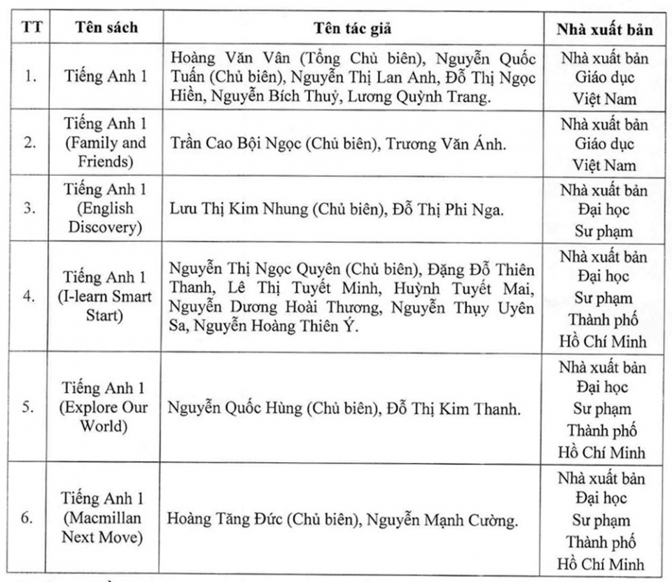 “Danh mục sách giáo khoa lớp 1 môn tiếng Anh sử dụng trong cơ sở giáo dục phổ thông” do Bộ trưởng Bộ Giáo dục và Đào tạo Phùng Xuân Nhạ phê duyệt gồm 6 cuốn sách giáo khoa lớp 1 môn tiếng Anh. Trong số này có ba cuốn của Nhà Xuất bản Sư phạm thành phố Hồ Chí Minh; hai cuốn của Nhà Xuất bản Giáo dục Việt Nam và một cuốn của Nhà Xuất bản Đại học Sư phạm.