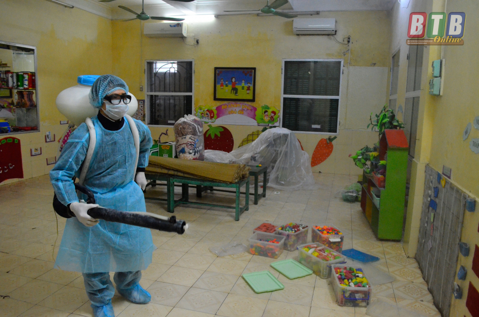 Từ sáng sớm, Ban giám hiệu, giáo viên, nhân viên Trường Mầm non Sơn Ca - Tiền Phong đã có mặt, tích cực phối hợp với các nhân viên của Trạm Y tế phường thực hiện tổng vệ sinh, phun thuốc khử trùng. Các khu vực được phun thuốc khử trùng bao gồm phòng học, phòng làm việc, phòng chức năng, hành lang, bếp ăn, khu vệ sinh. Nền nhà, bàn ghế, tay nắm cửa... được lau bằng chất tẩy rửa chuyên dụng; đồ chơi của trẻ được ngâm cloramin B25% để khử trùng.
