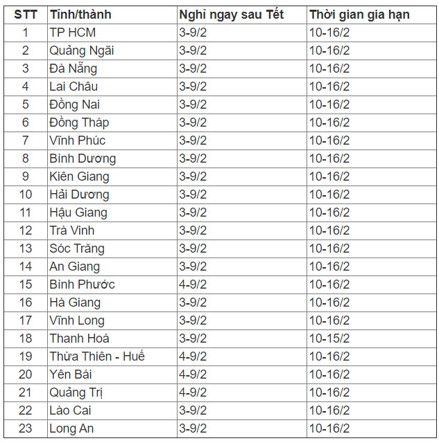 Một số địa phương như Hà Nội, Sở Giáo dục và Đào tạo kiến nghị UBND tỉnh thành xem xét cho nghỉ thêm một tuần. Khánh Hòa, Hà Tĩnh, Điện Biên, Nghệ An cho học sinh nghỉ tới khi có thông báo mới. Học sinh các tỉnh, thành còn lại đi học vào ngày 10/2.