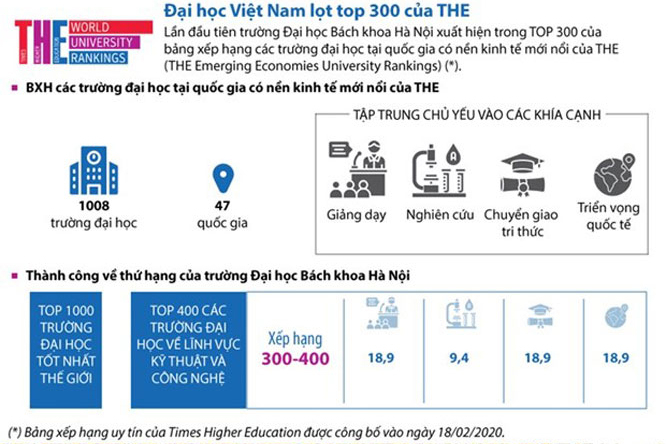 Tạp chí Times Higher Education (THE) vừa công bố bảng xếp hạng các trường đại học thuộc các nền kinh tế mới nổi (Emerging Economies) năm 2020. Theo đó, lần đầu tiên Việt Nam có ba trường đại học nằm trong bảng xếp hạng này, gồm Đại học Quốc gia Hà Nội, Trường Đại học Bách khoa Hà Nội và Đại học Quốc gia thành phố Hồ Chí Minh.