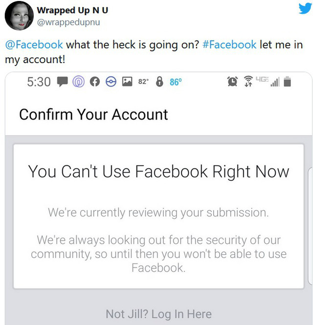 Một lời phàn nàn trên Twitter của người dùng tại Mỹ khi tài khoản Facebook của họ bất ngờ bị khóa không rõ nguyên do