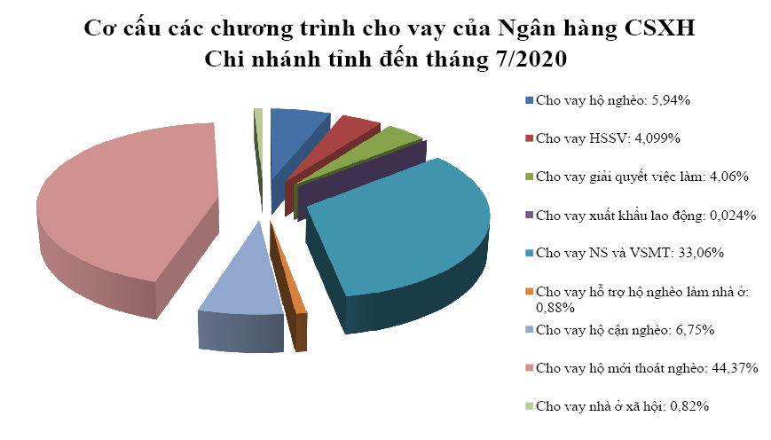 Ngân hàng CSXH Chi nhánh tỉnh hiện đang thực hiện cho vay 9 chương trình theo Nghị định số 78 của Chính phủ, trong đó có một số chương trình có tỷ lệ dư nợ cho vay cao như: cho vay nước sạch và vệ sinh môi trường nông thôn, cho vay hộ mới thoát nghèo, cho vay hộ cận nghèo...
