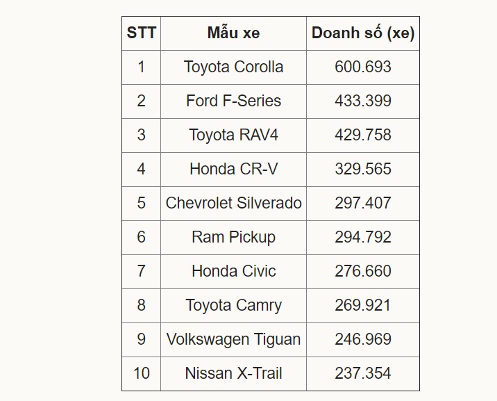 Mỹ vẫn là mảnh đất màu mỡ dành cho các mẫu xe bán tải cỡ lớn. Ford F-Series tiếp tục là dòng pick-up được ưa chuộng nhất. Tiêu thụ tại Mỹ chiếm đến 99% doanh số toàn cầu của F-Series. Sức mua của thị trường xứ cờ hoa lớn đến nỗi giúp mẫu xe này cán đích thứ 2 sau Toyota Corolla trong danh sách top 10.