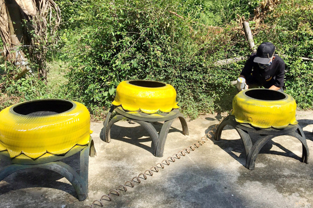 Trích từ quỹ hoạt động đoàn, các đoàn viên mua sơn màu, dụng cụ vẽ và tự tay mình thể hiện các ý tưởng trên lốp xe. Bằng sự sáng tạo và bàn tay khéo léo, những chiếc lốp được tạo hình và sơn họa tiết, có tính thẩm mỹ cao.