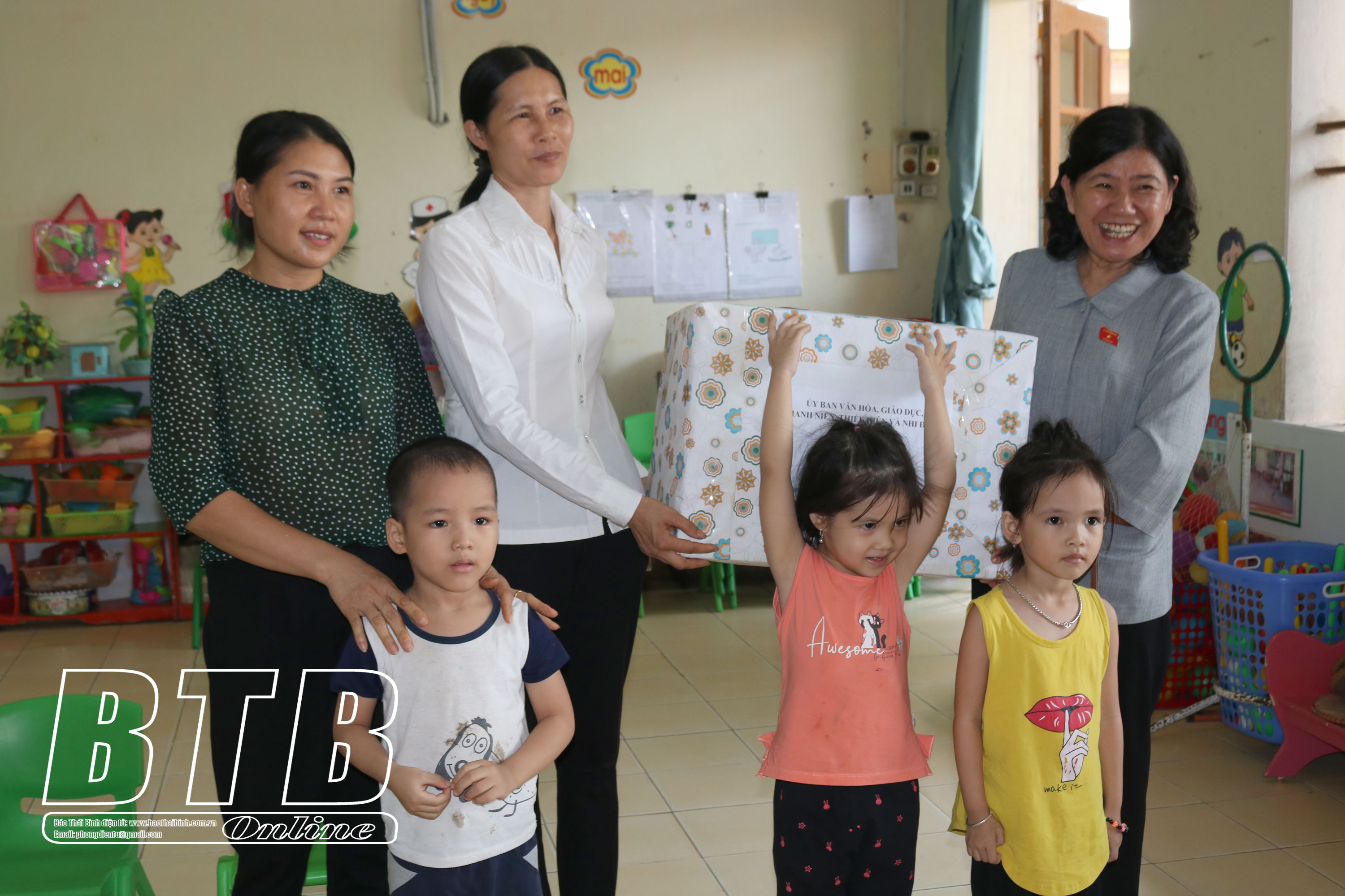 Đồng chí Hoàng Thị Hoa, Phó Chủ nhiệm Ủy ban Văn hóa, Giáo dục, Thanh niên, Thiếu niên và Nhi đồng, Quốc hội khóa XIV tặng quà các cháu Trường Mầm non Đông Sơn (Đông Hưng).