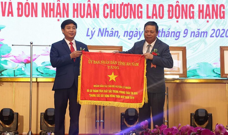 Đồng chí Nguyễn Xuân Đông, Phó Bí thư Tỉnh ủy, Chủ tịch UBND tỉnh trao Cờ thi đua xuất sắc cho huyện Lý Nhân đã có thành tích xuất sắc trong phong trào thi đua chung sức xây dựng nông thôn mới năm 2019.