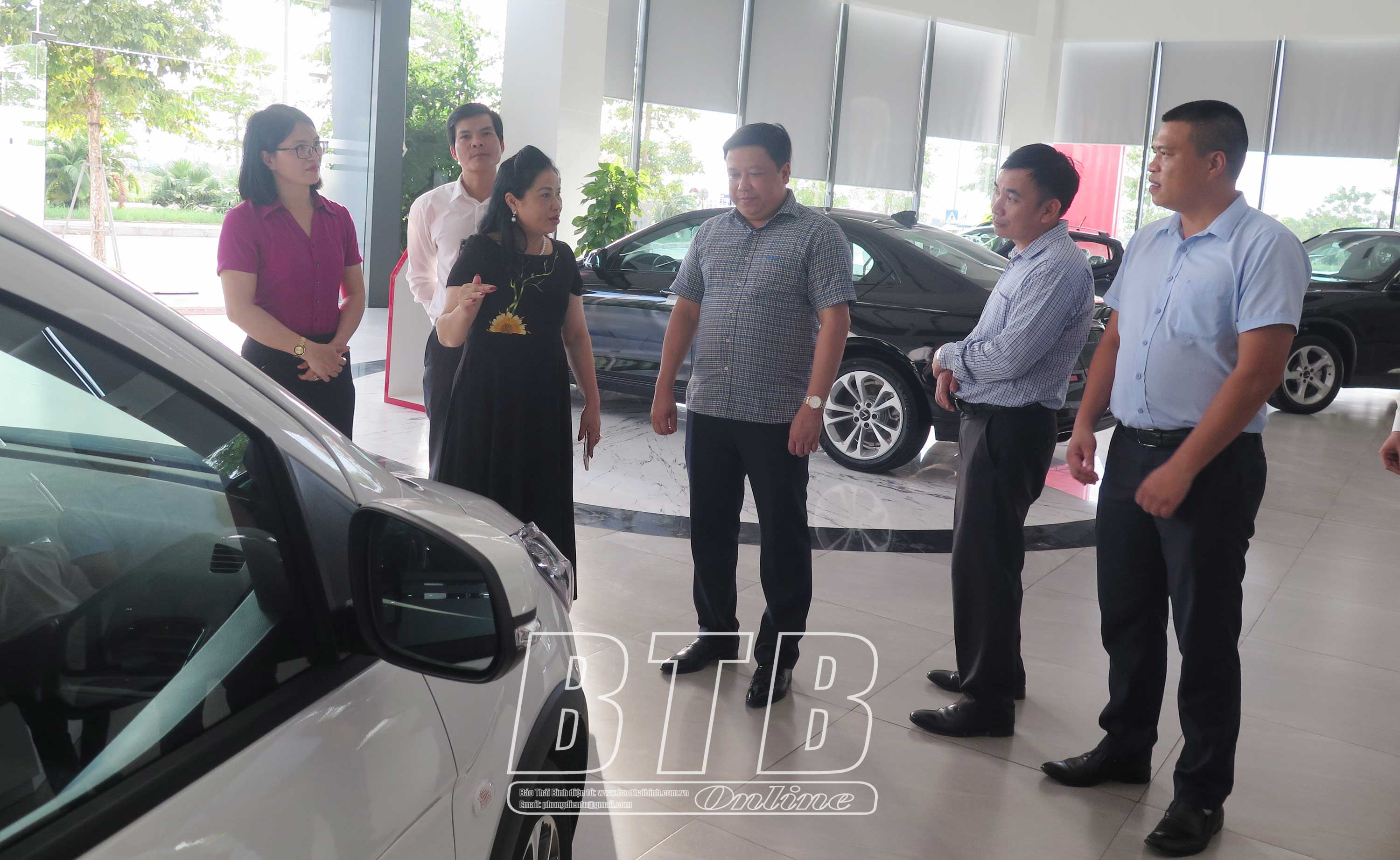Bà Vũ Thị Thà, Chủ tịch Hội đồng quản trị kiêm Tổng giám đốc Công ty Cổ phần Đầu tư Xuất nhập khẩu Thăng Long giới thiệu với lãnh đạo Đảng ủy Khối doanh nghiệp tỉnh lĩnh vực kinh doanh ô tô, xe máy điện Vinfast.