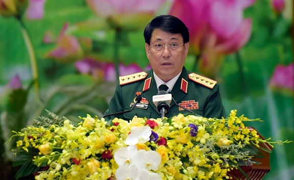 Thay mặt Đoàn Chủ tịch, Đại tướng Lương Cường trình bày Báo cáo tổng hợp ý kiến đóng góp của các Đảng bộ trực thuộc QUTƯ tham gia vào dự thảo các văn kiện Trung ương trình Đại hội XIII của Đảng.