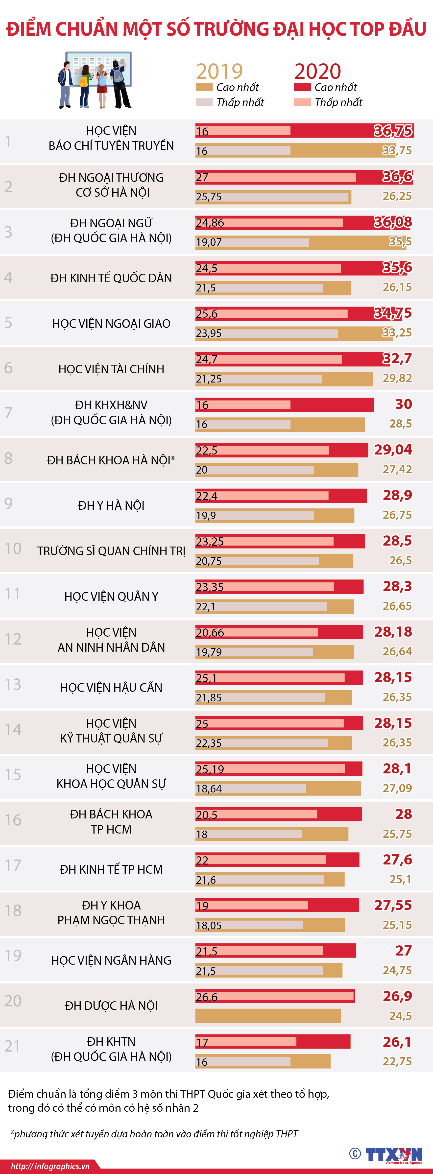 Điểm chuẩn một số trường đại học top đầu năm 2019, 2020