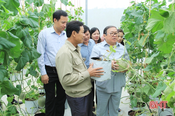 Chủ tịch Hội Nông dân Việt Nam Thào Xuân Sùng thăm mô hình dưa lưới công nghệ cao tại HTX Nga Hải (xã Xuân Mỹ)