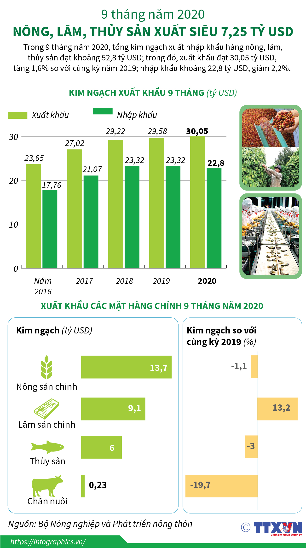 Trong 9 tháng năm 2020, tổng kim ngạch xuất nhập khẩu hàng nông, lâm, thủy sản đạt khoảng 52,8 tỷ USD; trong đó, xuất khẩu đạt 30,05 tỷ USD, tăng 1,6% so với cùng kỳ năm 2019; nhập khẩu khoảng 22,8 tỷ USD, giảm 2,2%.