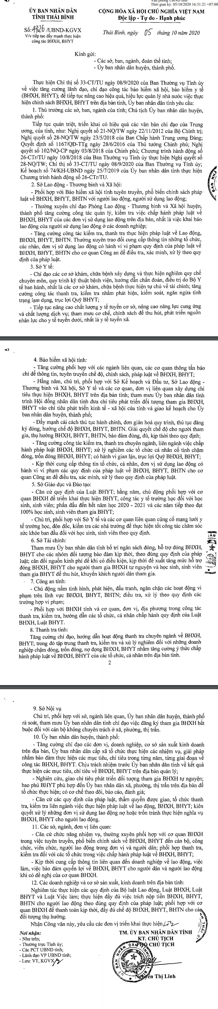 Ngày 5/10/2020, Ủy ban nhân dân tỉnh Thái Bình ban hành Công văn số 4726/UBND-KGVX về việc tiếp tục đẩy mạnh thực hiện công tác BHXH, BHYT.