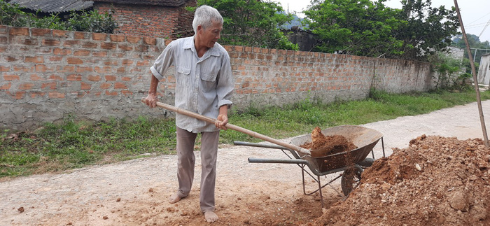 Bà Đặng Thị Liệu, xóm Đa Lộc, xã Nam Kim xúc đất làm lại vườn sau khi hiến đất để mở rộng đường thôn.