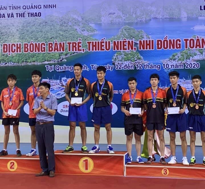 Vũ Tiến Đạt cùng đồng đội nhận thưởng tại Giải vô địch bóng bàn trẻ, thiếu niên, nhi đồng toàn quốc tổ chức tại Quảng Ninh.