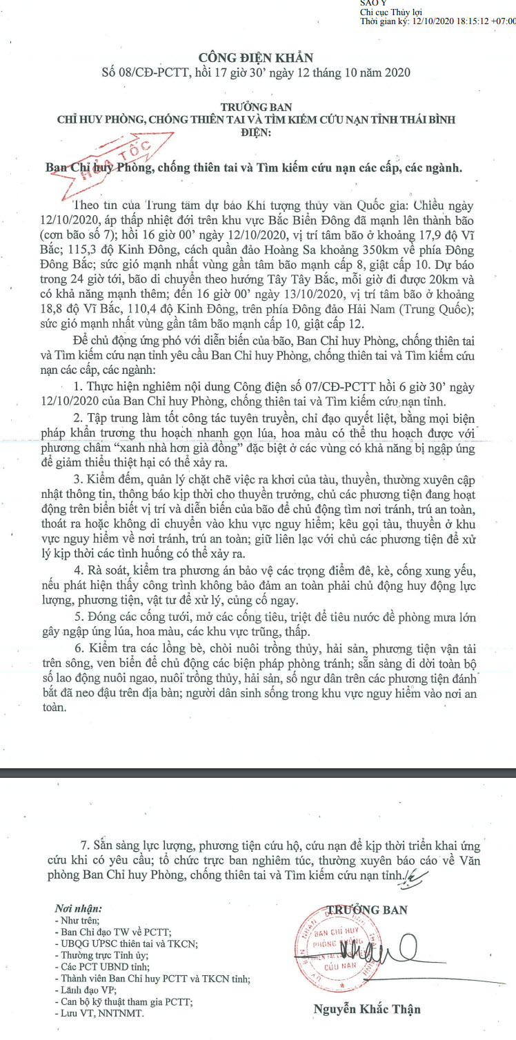 Ngày 12/10, Ban Chỉ huy Phòng, chống thiên tai và Tìm kiếm cứu nạn tỉnh Thái Bình có Công điện số 08/CĐ-PCTT gửi Ban Chỉ huy Phòng chống thiên tai và Tìm kiếm cứu nạn các cấp, các ngành.