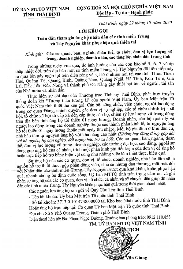 Ngày 22/10/2020, Ủy ban MTTQ Việt Nam tỉnh Thái Bình ra Lời kêu gọi toàn dân tham gia ủng hộ nhân dân các tỉnh miền Trung và Tây Nguyên khắc phục hậu quả thiên tai.