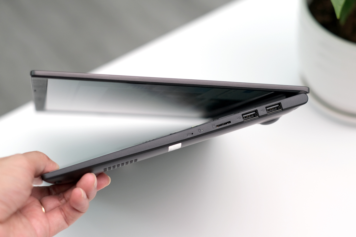 So với đối thủ Aspire 15, Vivobook S14/S15 có nhiều cổng kết nối hơn. Bên trái có cổng HDMI, USB-C, giắc cắm tai nghe và USB chuẩn cũ. Nhưng điểm đáng tiếc là máy vẫn dùng chuẩn sạc riêng kiểu cũ thay vì sạc qua cổng USB tiện dụng như nhiều model tầm giá trên 20 triệu đồng khác hay MateBook 5 cùng tầm giá từ Huawei.
