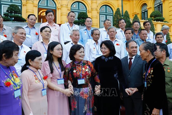 Phó Chủ tịch nước Đặng Thị Ngọc Thịnh với các đại biểu người có công tỉnh Tiền Giang. Ảnh: Dương Giang/TTXVN