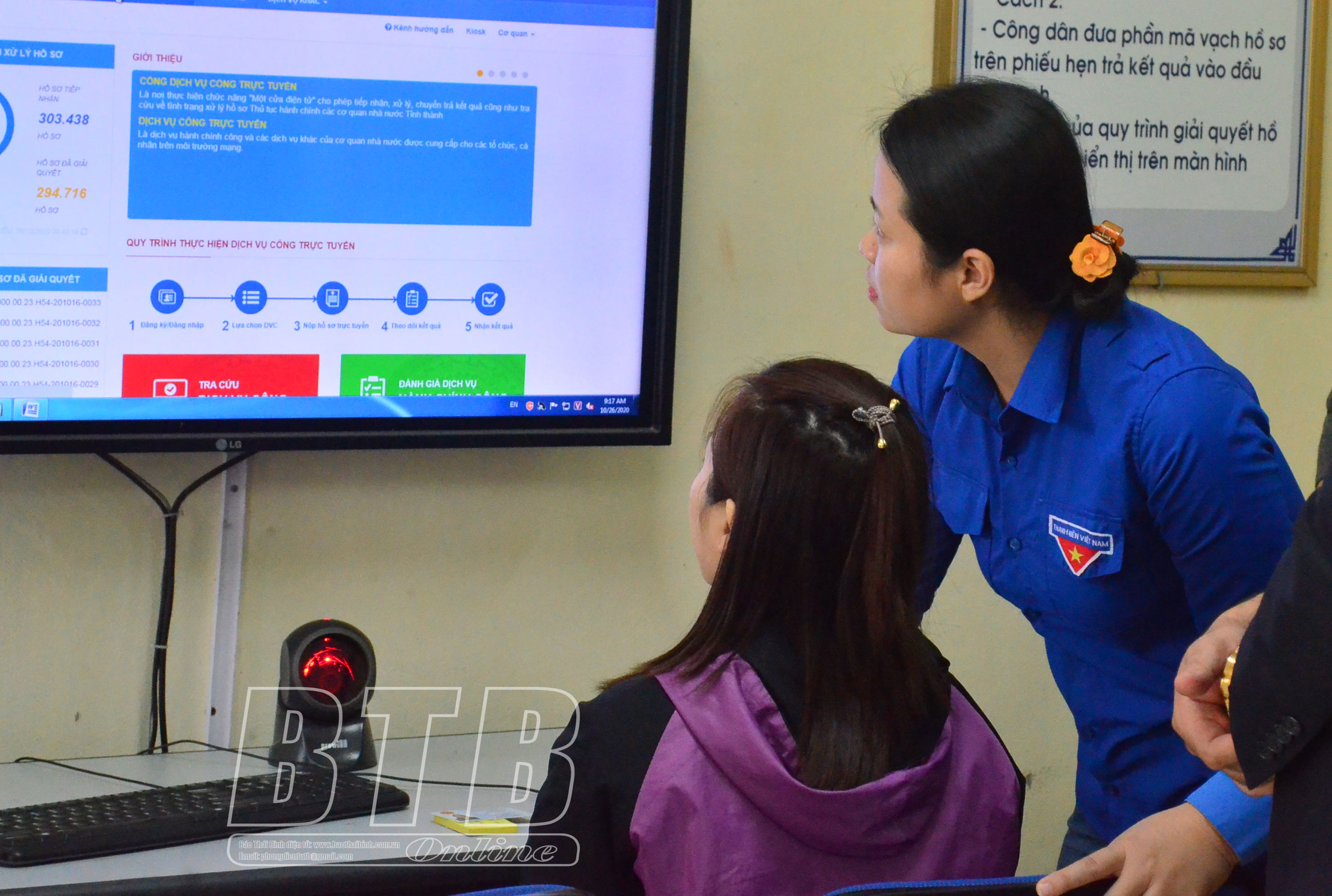 Cán bộ Đoàn Thanh niên hướng dẫn người dân sử dụng dịch vụ công trực tuyến tại Bộ phận tiếp nhận và trả kết quả huyện Quỳnh Phụ.