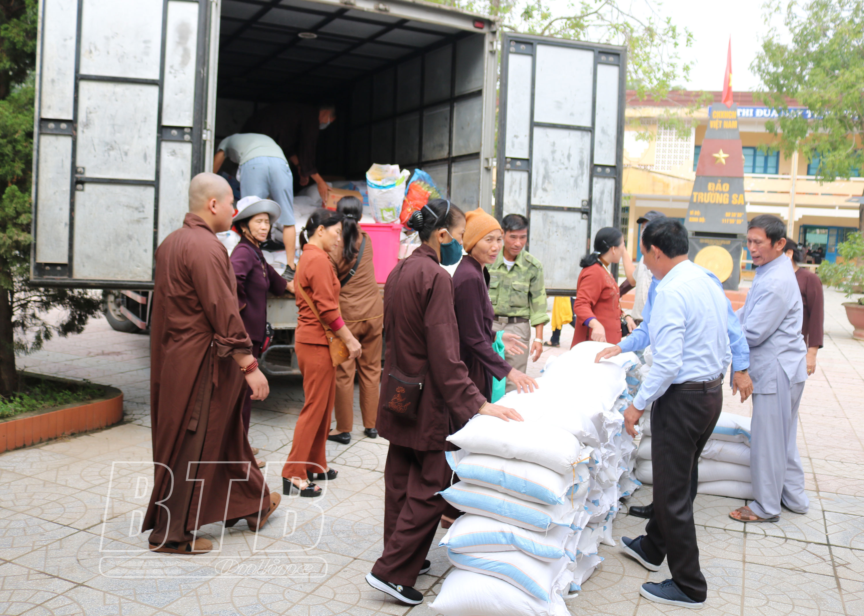 Các tăng ni, Phật tử chùa Từ Xuyên vận chuyển gạo ủng hộ Trường THCS Thành Cổ, thị xã Quảng Trị.
