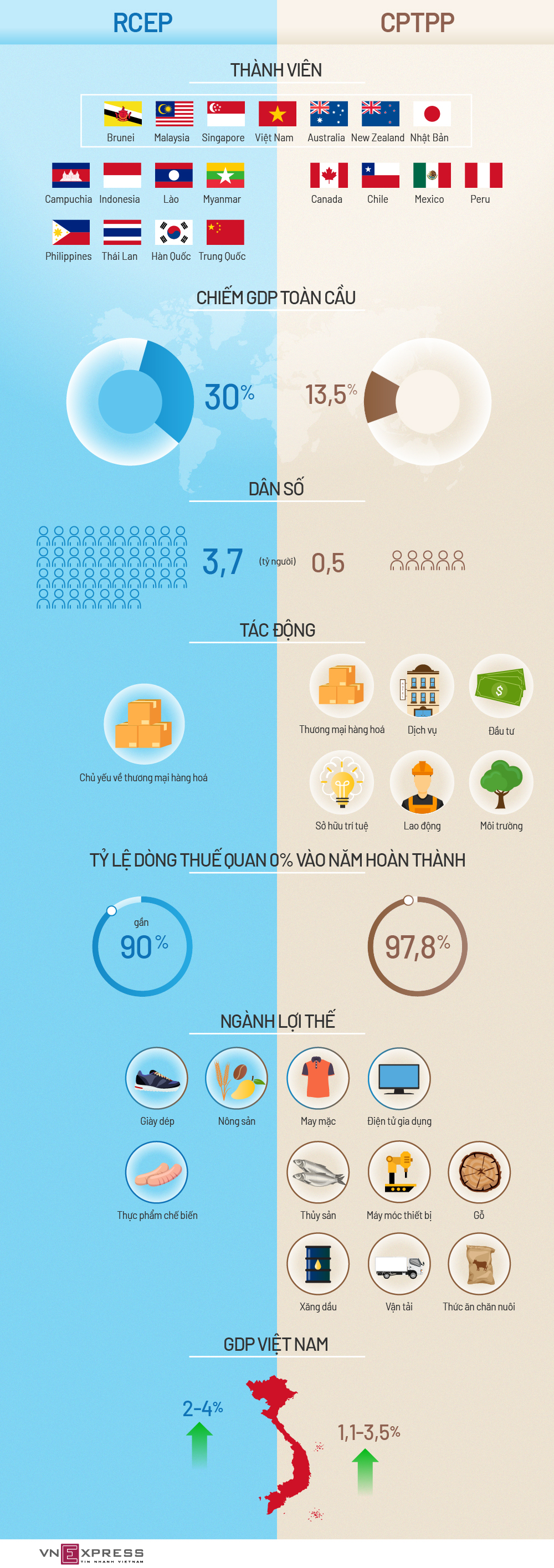 Với sự tham gia của Trung Quốc, Nhật và Hàn Quốc, RCEP bao phủ quy mô GDP lớn hơn nhưng các tiêu chuẩn được xem là "dễ thở" hơn CPTPP.