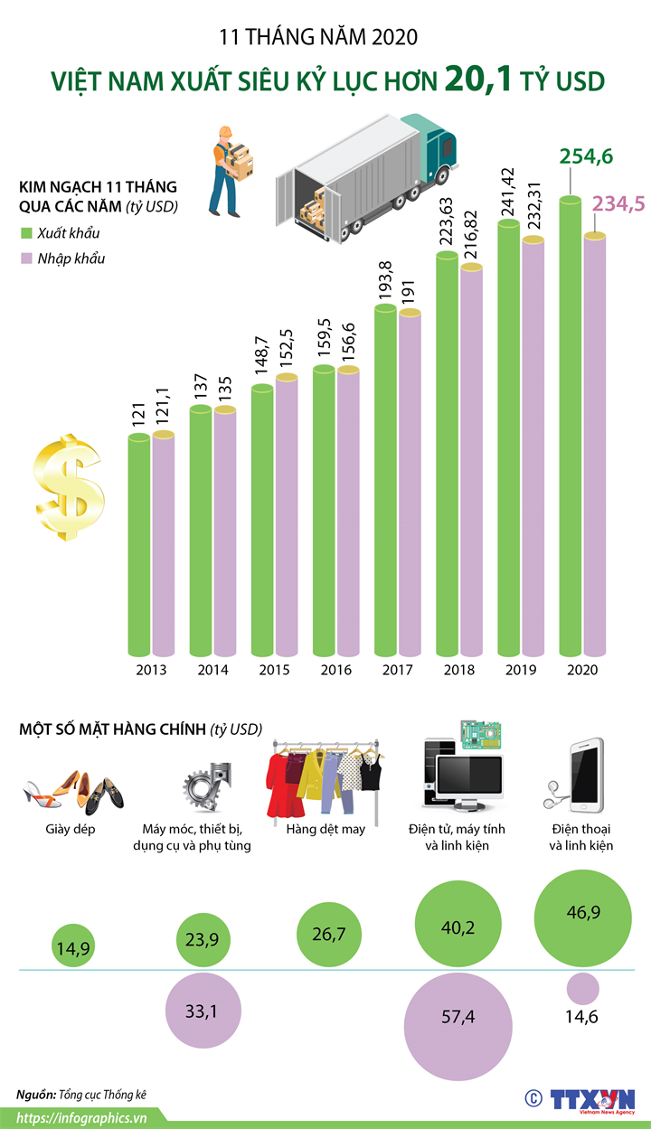 11 tháng năm 2020, tổng kim ngạch xuất, nhập khẩu hàng hóa ước đạt 489,1 tỷ USD, tăng 3,5% so với cùng kỳ năm 2019, đạt mức xuất siêu kỷ lục 20,1 tỷ USD.
