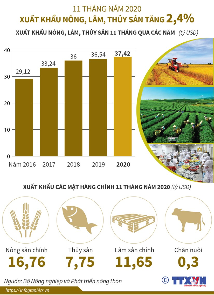 Tổng giá trị xuất khẩu nông, lâm, thủy sản 11 tháng năm 2020 đạt 37,42 tỷ USD, tăng 2,4% so với cùng kỳ năm 2019.