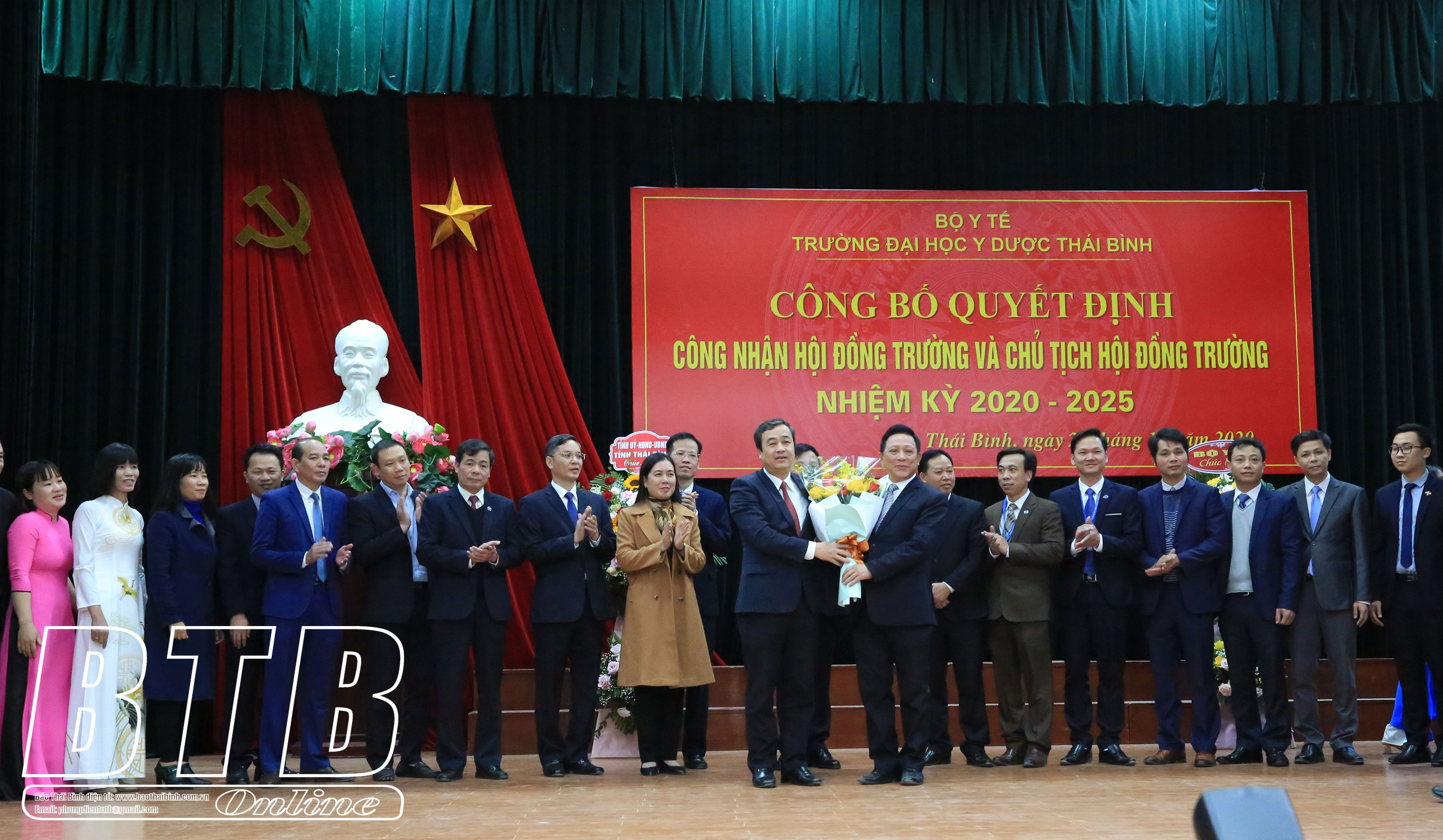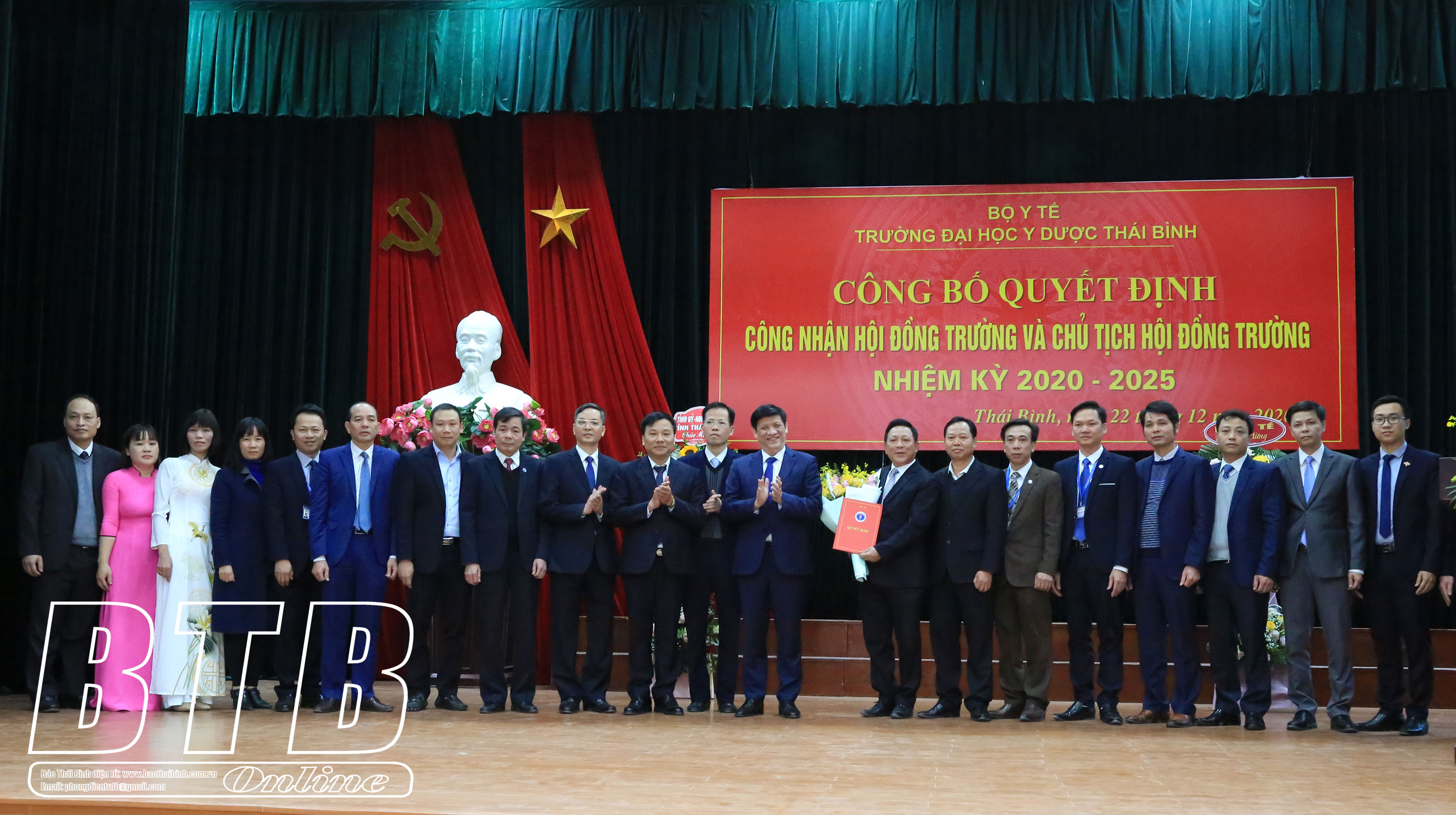 Tại buổi lễ, GS.TS Nguyễn Thanh Long, Bí thư Ban cán sự Đảng, Bộ trưởng Bộ Y tế đã trao Quyết định số 3862/QĐ-BYT của Bộ Y tế về việc công nhận Hội đồng Trường Đại học Y Dược Thái Bình nhiệm kỳ 2020 - 2025 và Quyết định số 3863/QĐ-BYT của Bộ Y tế về việc phê chuẩn Chủ tịch Hội đồng Trường Đại học Y Dược Thái Bình nhiệm kỳ 2020 – 2025 cho PGS.TS Nguyễn Quốc Tiến, Bí thư Đảng ủy, Phó Hiệu trưởng, Chủ tịch Hội đồng Trường Đại học Y Dược Thái Bình.