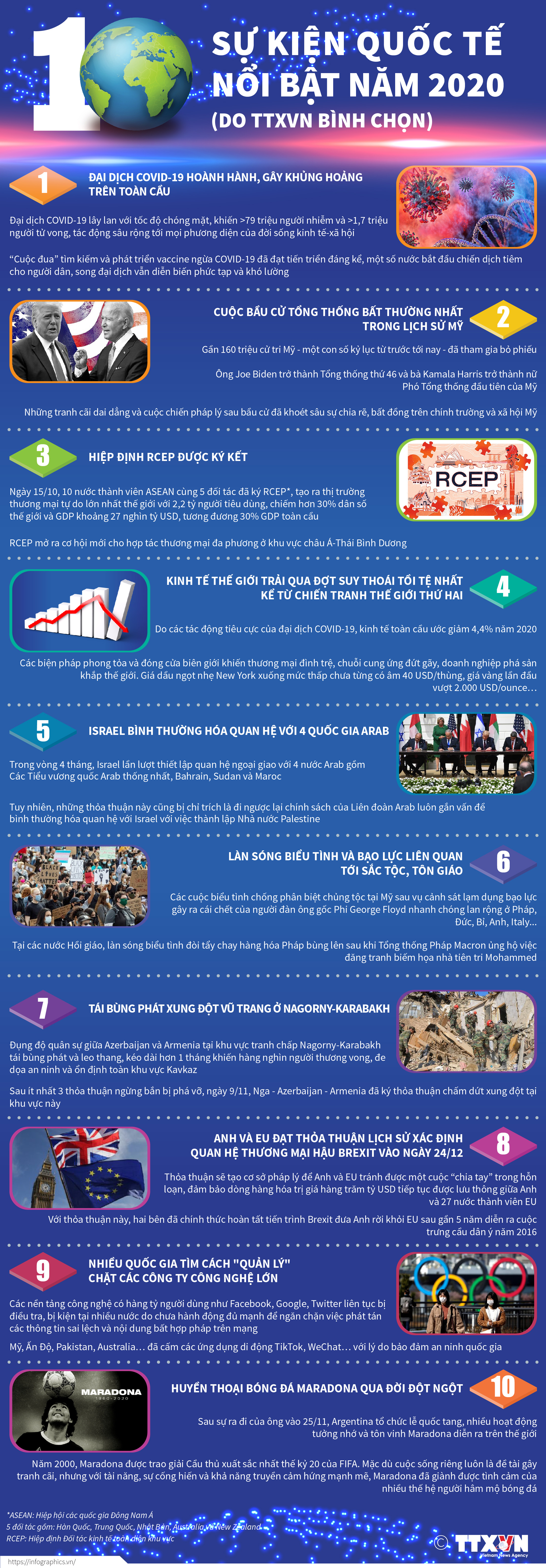 Năm 2020 sắp qua đi với nhiều biến động trên toàn cầu, từ đại dịch COVID-19 hoành hành khắp các châu lục, sự suy thoái nghiêm trọng của nền kinh tế thế giới cho tới những tranh cãi xung quanh cuộc bầu cử Tổng thống Mỹ, làn sóng biểu tình do sắc tộc diễn ra tại nhiều nơi... Dưới đây là 10 sự kiện quốc tế nổi bật năm 2020 do TTXVN bình chọn.