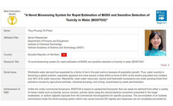 Giải thưởng gồm các hạng mục sáng tạo tốt nhất, sáng tạo xuất sắc và khuyến khích. Trong đó, giải thưởng sáng tạo tốt nhất năm 2021 đã thuộc về bà Phạm Thị Thúy Phương, Viện Công nghệ Hóa học, Viện Hàn lâm Khoa học và Công nghệ Việt Nam với công trình "Một hệ thống cảm biến sinh học mới để ước tính nhanh BOD5 và phát hiện độc tính trong nước".