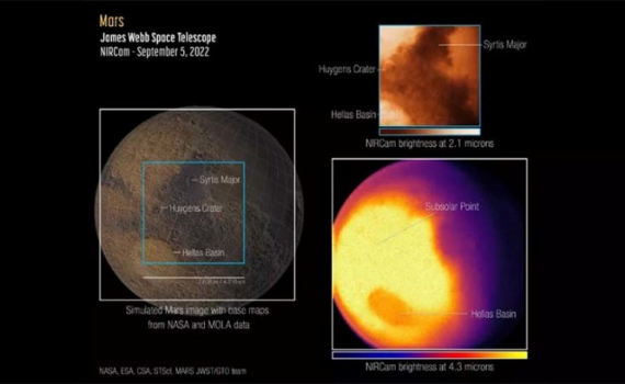 Bên trái là bản đồ tham chiếu của bán cầu đông do tàu Mars Global Surveyor chụp (tàu vũ trụ này dừng hoạt động vào năm 2006). Phía trên bên phải là ảnh chụp của James Webb, cho thấy ánh sáng Mặt Trời phản chiếu trên bề mặt sao Hỏa và nhiều cấu trúc như hố trũng Huygens, đá núi lửa sẫm màu và Hellas Planitia - hố va chạm dài tới 2.000 km.