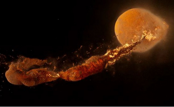 Tác động khổng lồ từ cú va chạm sẽ tạo ra một trường mảnh vụn khổng lồ, mà từ đó Mặt Trăng sẽ hình thành một cách từ từ sau hàng nghìn năm.