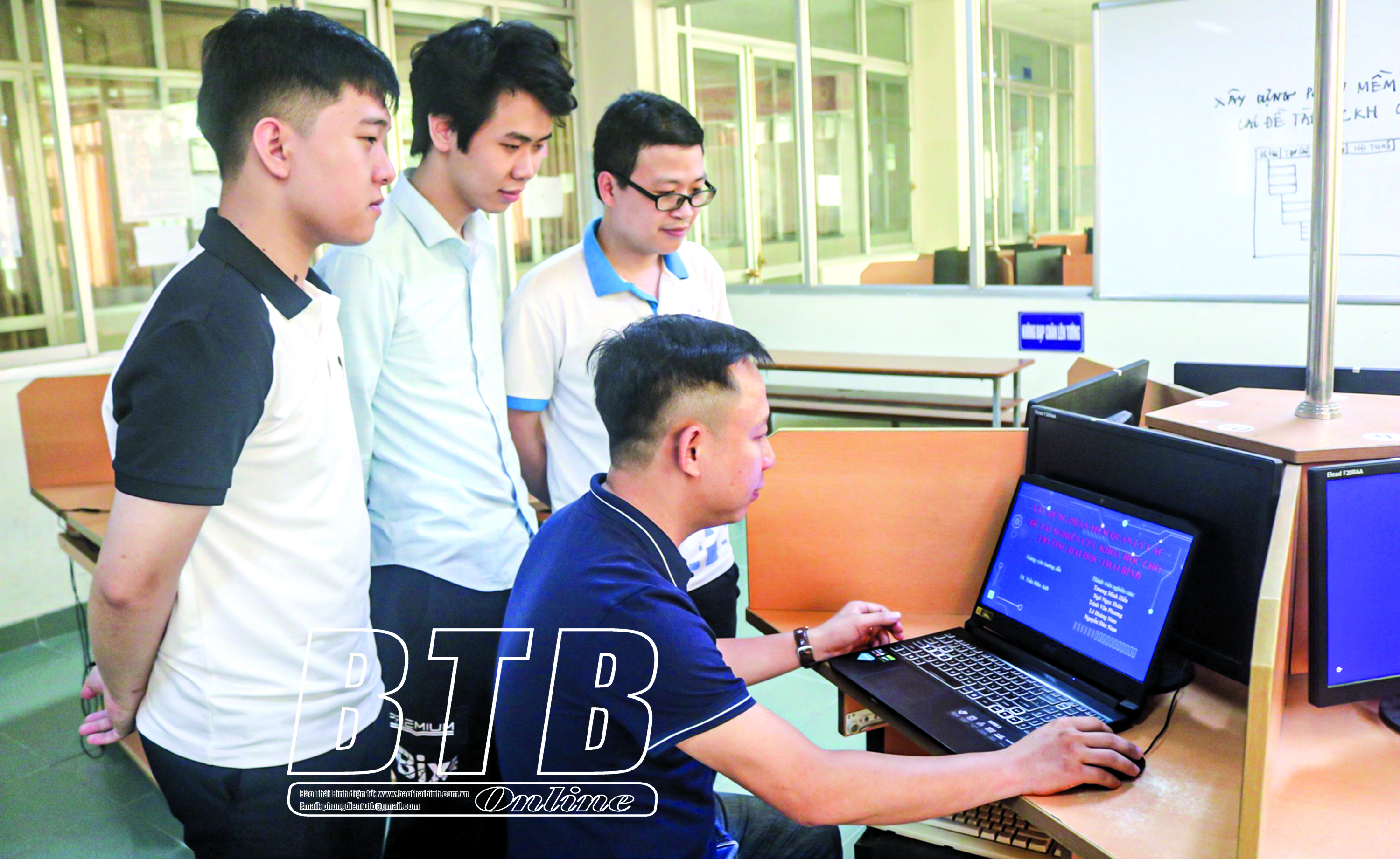 Tiến sĩ Trần Hữu Anh, giảng viên Khoa Công nghệ thông tin, Trường Đại học Thái Bình hướng dẫn sinh viên thực hiện các đề tài nghiên cứu khoa học.