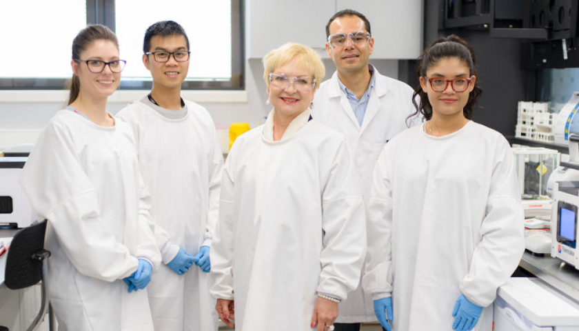 Nhóm nghiên cứu vật liệu diệt khuẩn cơ học đa chức năng. Từ trái qua phải: Denver Linklater, Lê Hoàng Phúc, Elena Ivanova, Arturo Aburto-Medina, Karolline De Sousa. Ảnh: Đại học RMIT