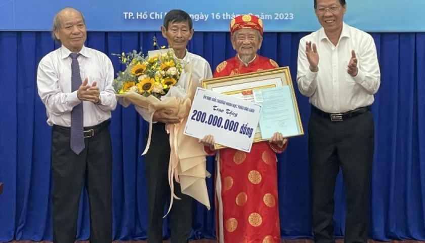 Chủ tịch UBND TP HCM Phan Văn Mãi (phải) trao giải khoa học Trần Văn Giàu cho nhà nghiên cứu Nguyễn Đình Tư (áo đỏ) với phần thưởng 200 triệu đồng, sáng 16/9.