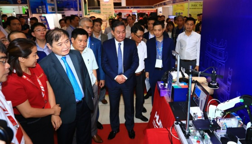 Các đại biểu tham quan gian hàng giới thiệu sản phẩm công nghệ tại sự kiện.