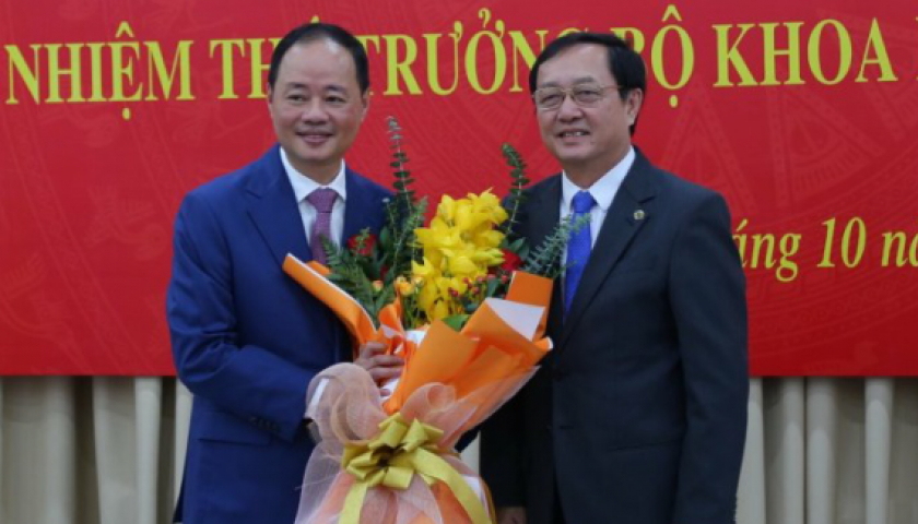 Bộ trưởng Bộ Khoa học và Công nghệ Huỳnh Thành Đạt (bìa phải) trao quyết định bổ nhiệm và hoa chúc mừng tân Thứ trưởng Trần Hồng Thái, sáng 17/10.