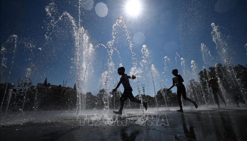 Trẻ em làm mát tại đài phun nước ở Colmar, miền Đông Pháp ngày 21/8/2023. Ảnh: AFP/TTXVN