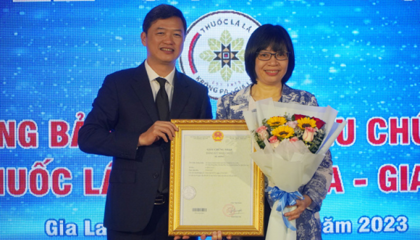 Ông Lưu Hoàng Long, Cục trưởng Cục Sở hữu trí tuệ trao văn bằng bảo hộ cho bà Nguyễn Thị Thanh Lịch, Phó chủ tịch UBND tỉnh Gia Lai.