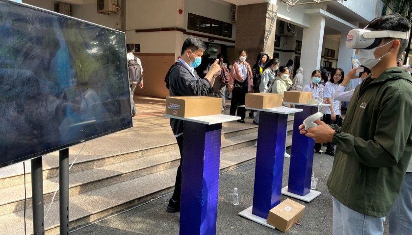 Trong ảnh, các bạn trẻ trải nghiệm kính thực tế ảo tại khu vực sân trường Đại học Bách khoa TP HCM - đơn vị đăng cai liên hoan.