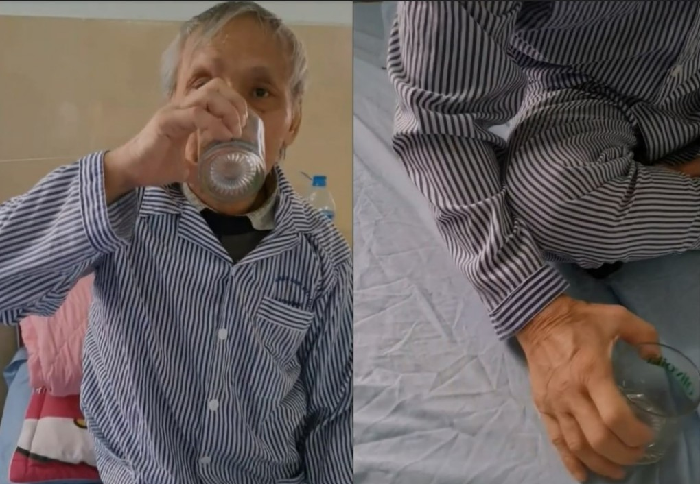 Bệnh nhân có thể cầm ly và uống nước sau khi sử dụng thiết bị của nhóm. Ảnh: NVCC.