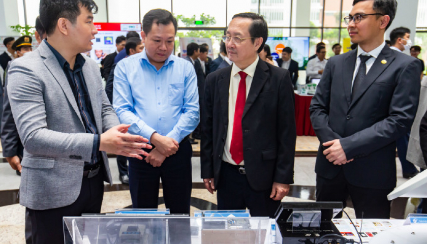 Bộ trưởng Khoa học và Công nghệ Huỳnh Thành Đạt (thứ hai từ phải qua) tham quan triển lãm Công nghệ chip bán dẫn tại Đại học Quốc gia Hà Nội hồi tháng 4/2023.