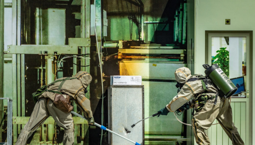 Lính phòng hóa diễn tập tẩy xạ vật thể nhiễm bẩn phóng xạ và khu vực xung quanh để bảo đảm an toàn nơi xảy ra sự cố tại Đà Nẵng.